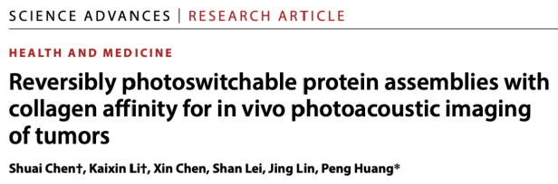 近日,深圳大學醫學部生物醫學工程學院黃鵬特聘教授團隊在國際頂級學術期Science Advances(影響因子11.7,中科院一區,TOP期刊)上發表了題為“Reversibly photoswitchable protein assemblies with collagen affinity for in vivo photoacoustic imaging of tumors”的研究論文。該研究的所有工作均在深圳大學完成,該團隊副研究員陳帥、研究生黎開心為論文共同第一作者,黃鵬教授為唯一通訊作者,深圳大學為唯一通訊單位,該團隊所在的生物醫學工程學科屬于廣東省優勢重點學科。