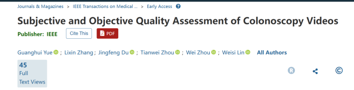 近日,深圳大學醫學部岳廣輝副教授在醫學圖像處理領域知名期刊IEEE Transactions on Medical Imaging (TOP期刊,中科院一區,IF=8.9)上發表題為“Subjective and Objective Quality Assessment of Colonoscopy Videos”的學術論文。深圳大學副教授、青年教師岳廣輝擔任第一作者,研究生張儷馨為第二作者。深圳大學為第一作者單位和通訊單位。
