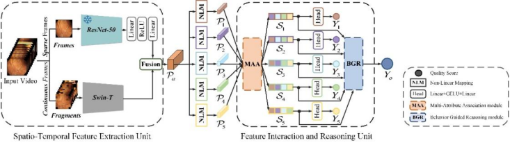 本研究構建了首個多屬性視覺感知標注的結腸鏡視頻質量評估數據集,包含1000個具有真實失真的結腸鏡視頻,從時空可視性、亮度、鏡面反射、穩定性和實用性五個失真屬性及整體質量進行標注,為VQA研究提供了基礎支持。此外,本研究提出了創新的無參考視頻質量評價方法DARNet。如圖所示,DARNet的網絡框架由STFE單元和FIR元組成。STFE單元包含兩個用于提取空間和時間質量失真特征的流,而FIR單元則由MAA模塊和BGR模塊構成。MAA模塊能夠自適應地聚合提取的特征,并預測每個失真屬性的質量分數;BGR模塊則根據被試對失真屬性相關性的反饋,在屬性感知特征之間進行交互推理,從而得出整體質量分數。