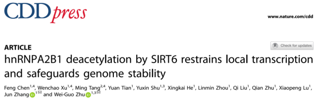 2024年11月,深圳大學醫學部卡爾森國際腫瘤中心朱衛國特聘教授團隊在Cell Death & Differentiation(影響因子12.4,TOP期刊,中科院一區)發表題為“hnRNPA2B1 deacetylation by SIRT6 restrains local transcription and safeguards genome stability”的研究論文,闡明了RNA結合蛋白hnRNPA2B1的去乙酰化修飾對于DNA損傷時局部轉錄抑制以及基因組穩定性的維持起到至關重要的作用。博士研究生陳鳳,碩士研究生許文超為本研究共同第一作者,醫學部助理教授張俊和特聘教授朱衛國為本文共同通訊作者。