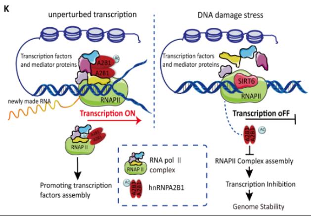 本研究揭示了RNA結合蛋白hnRNPA2B1作為一個關鍵的轉錄相關因子在正常情況下對于維持轉錄復合物的穩定性至關重要。然而,當DNA損傷發生時,hnRNPA2B1會脫離損傷位點,并進一步降低RNA聚合酶Ⅱ復合物的組裝效率,從而導致局部的轉錄抑制。機制上,該團隊鑒定出SIRT6使hnRNPA2B1在K113/173殘基上發生去乙酰化使其快速脫離DNA損傷位點,這一行為破壞了活躍染色質上RNA聚合酶Ⅱ復合物的完整性。功能研究顯示,hnRNPA2B1去乙酰化或缺失有利于DSB修復,且乙酰化模擬物對基因毒性療法更加敏感。這一事實提示可以通過抑制SIRT6活性來減少hnRNPA2B1在DNA損傷位點的脫離以增強某些特定腫瘤細胞對放化療的敏感性。這一研究結果為深入理解轉錄抑制在基因組穩定性維持過程中的具體機制提供了新思路,并為探索針對hnRNPA2B1異常表達癌癥的治療提供了潛在新策略(具體工作模式圖如下)。