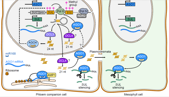 RNA 沉默通過(guò) DNA 甲基化、組蛋白修飾、mRNA 切割或翻譯抑制,在轉(zhuǎn)錄或轉(zhuǎn)錄后水平上對(duì)基因表達(dá)產(chǎn)生負(fù)向調(diào)節(jié)。植物small RNA主要分為miRNA和siRNA兩大類。AMP1和AGO1 在miRNA介導(dǎo)的轉(zhuǎn)錄后基因沉默 (PTGS) 過(guò)程中發(fā)揮重要作用, 而其在siRNA生物發(fā)生過(guò)程中的作用還不清楚。