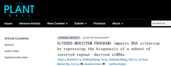 2024年11月6日,生科院劉琳副教授課題組與北京大學(xué)陳雪梅院士團(tuán)隊(duì)合作在Nature Index期刊The Plant Cell(1區(qū)TOP,影響因子10.0)在線發(fā)表題為“ALTERED MERISTEM PROGRAM1 impairs RNA silencing through repressing the biogenesis of a subset of inverted repeats-derived siRNAs in Arabidopsis”研究論文,揭示了AMP1和AGO1調(diào)節(jié)反向重復(fù)序列衍生的siRNA生物發(fā)生的新機(jī)制。