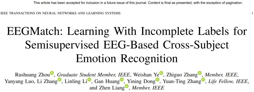 近日,醫(yī)學部生物醫(yī)學工程學院梁臻老師在計算機科學知名期刊IEEE Transactions on Neural Networks and Learning Systems(中科院一區(qū)TOP,影響因子10.2)上發(fā)表題為“EEGMatch: Learning with Incomplete Labels for Semi-Supervised EEG-based Cross-Subject Emotion Recognition”的論文。香港城市大學博士研究生周如雙(18級深圳大學本科生)、深圳大學研究生葉煒珊和哈爾濱工業(yè)大學(深圳)張治國教授為共同第一作者,深圳大學梁臻副教授為獨立通訊作者。深圳大學為第一作者單位和通訊單位。