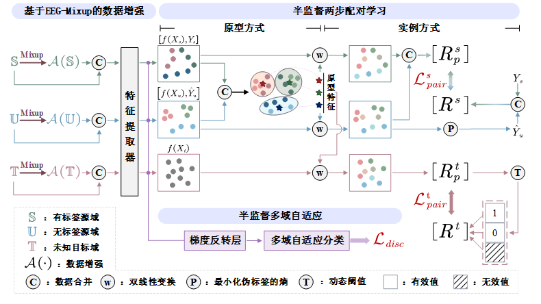 EEGMatch包含三個核心模塊:(1)EEG-Mixup數(shù)據(jù)增強。我們提出了一種新的數(shù)據(jù)增強方法,通過生成更多有效樣本來幫助模型訓練。這種方法針對EEG信號的非平穩(wěn)特性,提升了數(shù)據(jù)增強的效果,即使標簽數(shù)據(jù)稀缺,也能為模型提供足夠的信息。(2)半監(jiān)督兩步配對學習,包括原型級和實例級配對學習。原型級配對通過全局關(guān)系捕捉情緒類別特征,實例級配對則關(guān)注局部內(nèi)在關(guān)系。這樣可以從有限的標簽數(shù)據(jù)中提取情緒的關(guān)鍵特征,尤其在情緒信號復雜時表現(xiàn)出色。(3)半監(jiān)督多域自適應方法。該方法幫助對齊不同域(如有標簽和無標簽的數(shù)據(jù)集)之間的特征表示,減輕了分布失配問題,尤其適用于跨受試者情緒識別,提升模型的泛化能力。通過這三個創(chuàng)新模塊,EEGMatch有效解決了EEG情緒識別中的標簽稀缺問題,并能在不同受試者間準確識別情緒。