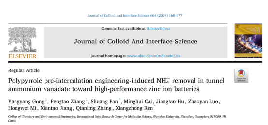深圳大學化學與環境工程學院任祥忠教授團隊在材料領域頂尖期刊《Journal of Colloid And Interface Science》(影響因子9.1,中科院JCR 1區,TOP期刊)發表了題為《Polypyrrole pre-intercalation engineering-induced NH4+removal in tunnel ammonium vanadate toward high-performance zinc ion batteries》的研究論文。該團隊碩士生龔洋洋和張鵬濤為本文的共同第一作者,深圳大學任祥忠教授和范爽專職研究員為該論文共同通訊作者,深圳大學為第一作者單位和第一通訊單位。