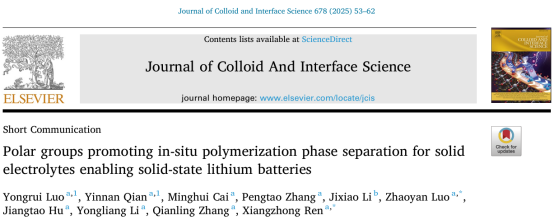 深圳大學化學與環境工程學院任祥忠教授團隊在國際能源領域著名期刊《Journal of Colloid And Interface Science》(影響因子9.4,中科院JCR1區,TOP期刊)上發表了題為《Polar groups promoting in-situ polymerization phase separation for solid electrolytes enabling solid-state lithium batteries》的論文。該團隊碩士生羅永睿和博士生錢音男為共同第一作者,任祥忠教授和羅兆艷助理教授為共同通訊作者,深圳大學為唯一通訊單位。