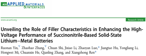 深圳大學化學與環境工程學院任祥忠教授團隊在期刊《ACS Applied Materials & Interfaces》(影響因子8.3,中科院JCR2區,TOP期刊)上發表了題為《Unveiling the Role of Filler Characteristics in Enhancing High-Voltage Performance of Succinonitrile-Based Solid-State Lithium Metal Batteries》的論文。該團隊碩士研究生尹若男和張兆昊為共同第一作者,任祥忠教授和羅兆艷助理教授為共同通訊作者。深圳大學為唯一作者單位和唯一通訊單位。