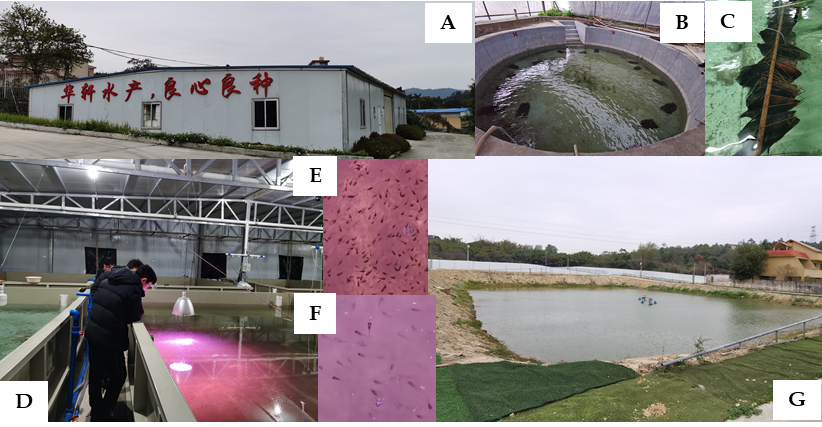 圖1 廣州華軒水產的加州鱸育苗養殖基地。(A)育種車間外觀;(B)親魚池;(C)卵片;(D)標粗池;(E-F)魚苗;(G)室外養殖大塘。