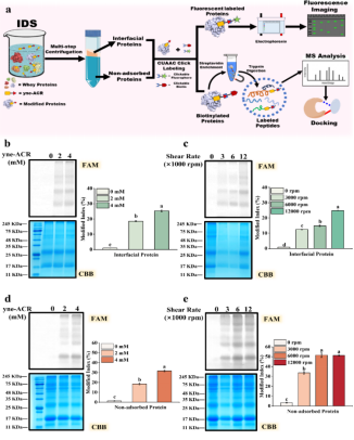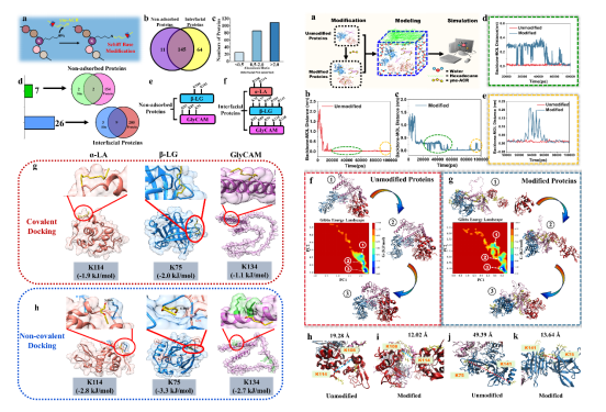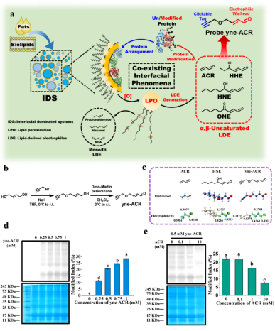 為驗證上述猜想,研究團隊以親電能力最強的α,β-不飽和醛為骨架,設計合成了帶有可點擊標簽的探針yne-ACR,模擬LDEs對蛋白的修飾作用。借助乳清蛋白-十六烷組成的水-油界面模擬體系,結合界面流體力學、化學蛋白質組學以及全原子分子動力學模擬等技術,系統解析了界面上LDEs對乳清蛋白的修飾作用及其界面行為的影響。實驗結果表明,LDEs對界面蛋白具有更顯著的修飾作用,被修飾蛋白在界面排布的穩定性下降,可在后續的剪切過程中脫離界面并在體相中形成蛋白聚集體。以上研究發現可為進一步理解界面在生物體內或食品加工過程中的重要作用提供新的視角。