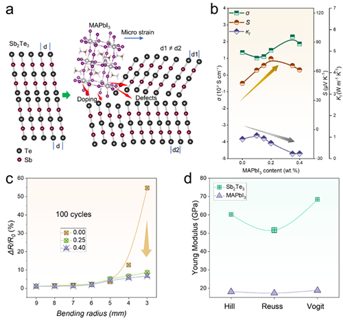 隨著可穿戴設備和柔性電子的迅猛發展,熱電材料作為實現自供能器件的核心功能單元,正日益受到研究人員的關注。在當前全球能源結構亟需向綠色、可持續方向轉型的背景下,熱電技術因其可直接將熱能轉化為電能,為低碳能源利用提供了新路徑。然而,傳統熱電材料在實現高性能與柔性的兼容性方面仍面臨巨大挑戰。因此,羅景庭教授和鄭壯豪特聘教授團隊提出了一種創新策略,通過引入有機-無機雜化鈣鈦礦材料MAPbI3到層狀Sb2Te3薄膜中,實現了熱電性能與機械柔性的協同增強。研究顯示,MAPbI3在原子尺度上誘發了Sb2Te3晶體結構的有序調控,有效抑制了(015)晶面生長,同時增強了(00l)晶面取向,從而優化了載流子遷移路徑,顯著提升了電子輸運能力。在界面處,MAPbI3分解產物中的Pb和I元素進一步實現了摻雜調控,有效降低了載流子濃度,提高了Seebeck系數。與此同時,材料內部形成的大角度晶界等晶格缺陷加強了聲子散射,顯著降低了晶格熱導率。在多重機制協同作用下,Sb2Te3薄膜在250℃時的熱電優值zT從原始的0.20提升至0.47。更為重要的是,MAPbI3的低楊氏模量使得復合薄膜在多次彎折后仍能保持優異的導電性能,其柔性性能在100次彎折循環后的電阻變化率從54.6%降至8.7%。此外,基于p型Sb2Te3與n型Bi2Te3構建的熱電器件在10K溫差下實現了33.5nW的輸出功率,驗證了其在可穿戴能源采集領域的應用潛力。