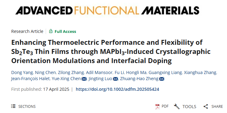 深圳大學物理與光電工程學院教授羅景庭在自然指數期刊Advanced Functional Materials上發表了題為“Enhancing Thermoelectric Performance and Flexibility of Sb2Te3Thin Films through MAPbI3-Induced Crystallographic Orientation Modulations and Interfacial Doping”的研究論文。物理與光電工程學院博士楊東為論文第一作者,羅景庭、助理教授陳躍星和特聘教授鄭壯豪為共同通訊作者,深圳大學為第一完成單位。