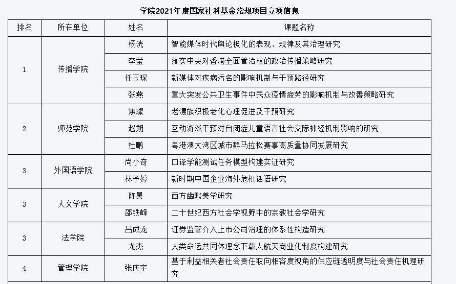 近日,2021年度國家社科基金常規(guī)項目立項名單公示,我校22個項目獲得立項。其中重點項目1項,一般項目11項,青年項目10項。截止目前,我校今年獲得國家社科基金項目立項數(shù)為27項。