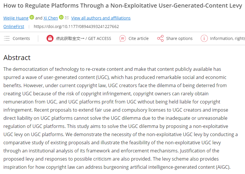 近日,我校法學院黃煒杰老師以第一作者身份、陳曦老師以通訊作者身份,以深圳大學為唯一署名單位,在Social Science Computer Review合作發表原創性論文How to Regulate Platforms Through a Non-Exploitative User-Generated-Content Levy。Social Science Computr Review(Social Science, Interdisciplinary Q1)屬SSCI一區期刊,該刊物2023年影響因子4.1,5年平均影響因子4.7。