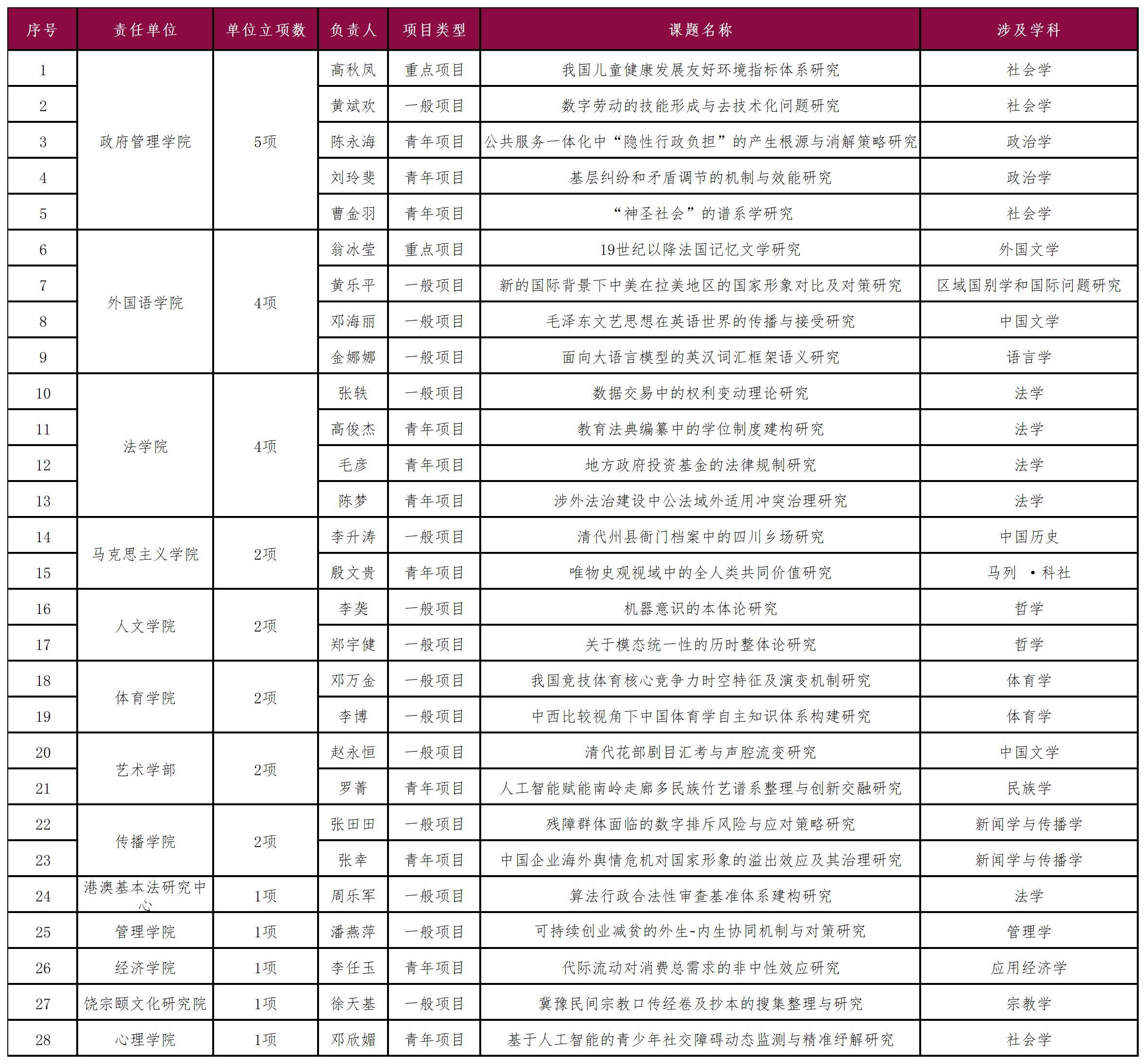 其中重點項目2項,一般項目15項,青年項目11項。截至目前,深圳大學已獲得國家社科基金各類項目共計31項。