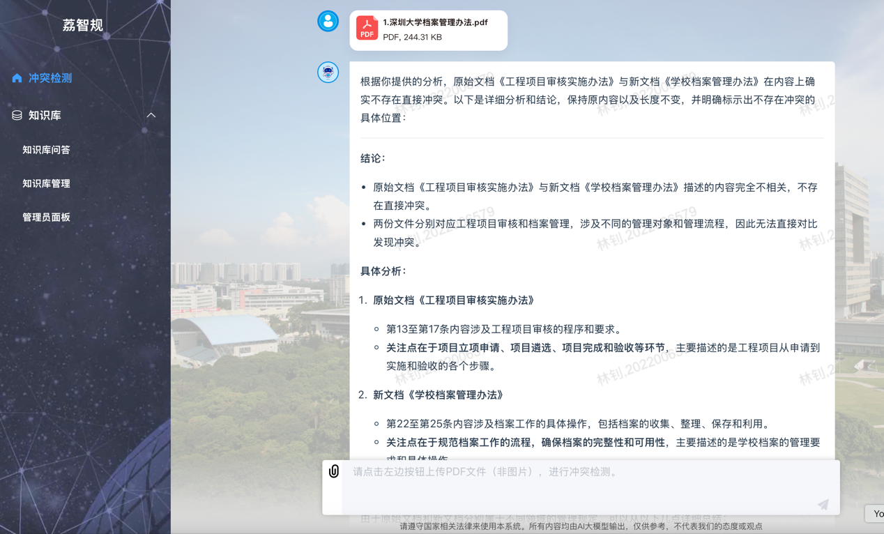 該系統基于大語言模型能力,具備制度智能問答與制度沖突檢測兩大核心功能,為師生提供高效、準確、智能的規章制度服務,標志著深圳大學在智慧校園與制度治理數字化建設方面邁出重要一步。