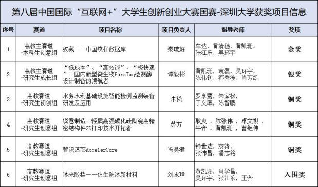 2022年11月13日,第八屆中國(guó)國(guó)際“互聯(lián)網(wǎng)+”大學(xué)生創(chuàng)新創(chuàng)業(yè)大賽全國(guó)總決賽金獎(jiǎng)爭(zhēng)奪賽順利落下帷幕。在此大賽中,由創(chuàng)新創(chuàng)業(yè)教育中心組織指導(dǎo)的深圳大學(xué)代表隊(duì)共斬獲六個(gè)國(guó)家級(jí)獎(jiǎng)項(xiàng),一金一銀三銅一入圍獎(jiǎng),實(shí)現(xiàn)歷史性突破!其中,紋藏代表隊(duì)喜獲1枚全國(guó)金獎(jiǎng),創(chuàng)造了深圳大學(xué)乃至深圳市本科高校的首枚國(guó)賽金獎(jiǎng)!